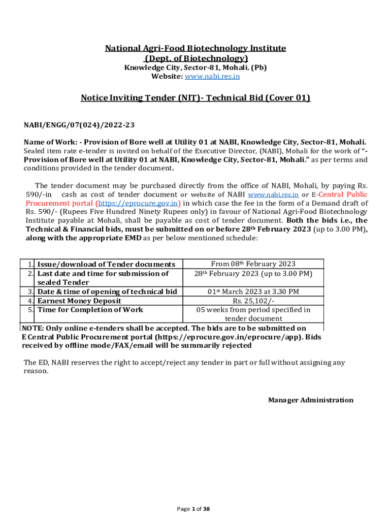 Get the free Name of Work: - Provision of Bore well at Utility 01 at NABI, Knowledge City, Sector...