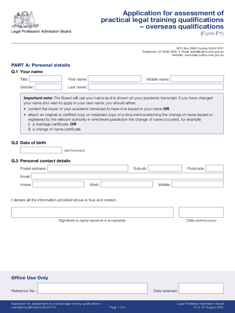 Application for assessment of practical legal training qualifications overseas qualifications (Form P1) GPO Box 3980 Sydney NSW 2001 Telephone: 02 9338 3500 I Email: lpab@justice.nsw.gov.au Website:
