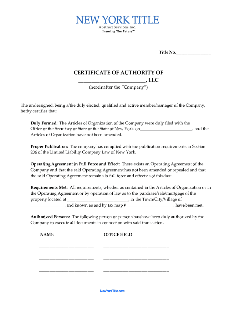 Title No. ___CERTIFICATE OF AUTHORITY OF ___, LLC (hereinafter the Company)The undersigned, being a/the duly elected, qualified and active member/manager of the Company, Derby certifies that: Duly
