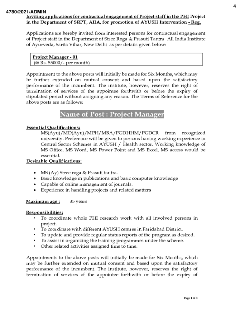 Get the free Name of Post : Project Manager - All India Institute of Ayurveda