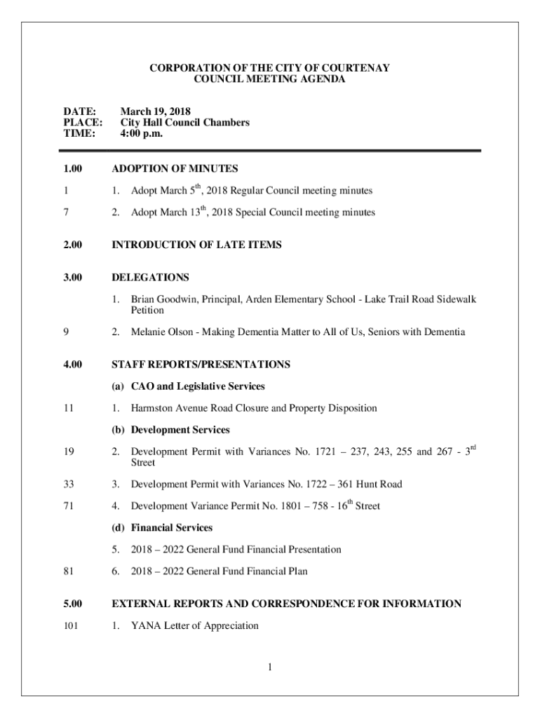 CORPORATION OF THE CITY OF COURTESY COUNCIL MEETING AGENDA DATE: PLACE: TIME:March 19, 2018, City Hall Council Chambers 4:00 p.m.1.00ADOPTION OF MINUTES11. Adopt March 5th, 2018 Regular Council meeting