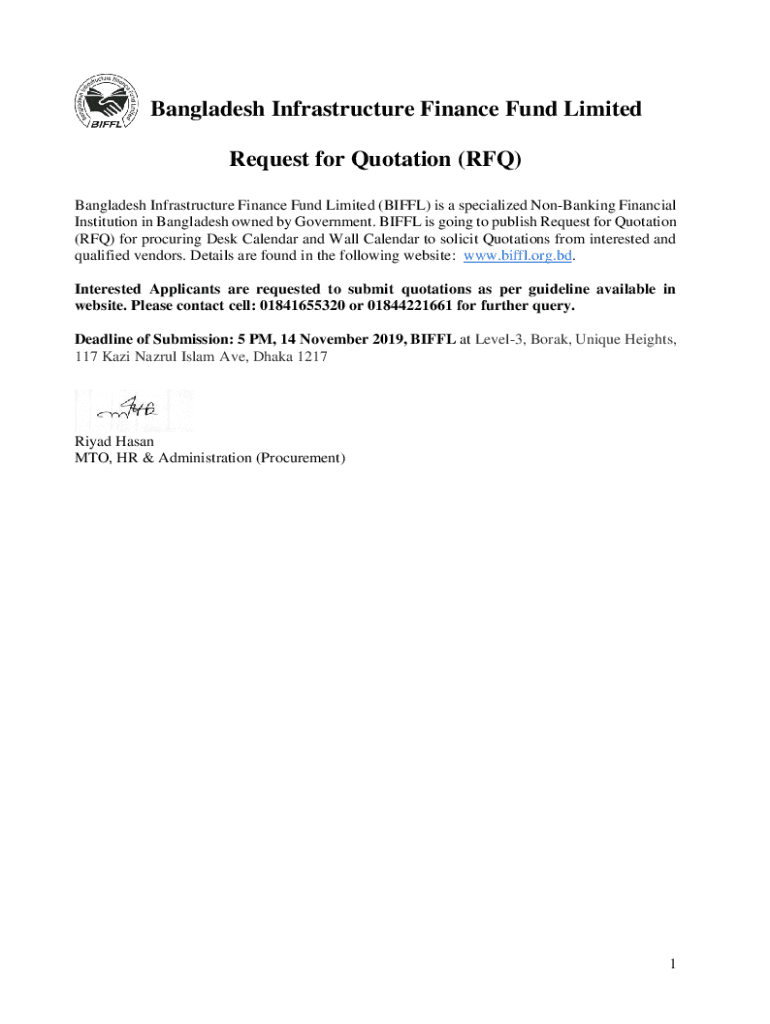 Bangladesh Infrastructure Finance Fund Limited Request for Quotation (RFQ) Bangladesh Infrastructure Finance Fund Limited (BIFF) is a specialized Nonbinding Financial Institution in Bangladesh owned
