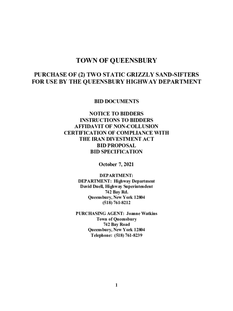 TOWN OF QUEENSBURY PURCHASE OF (2) TWO STATIC GRIZZLY SANDPIPERS FOR USE BY THE QUEENSBURY HIGHWAY DEPARTMENT BID DOCUMENTS NOTICE TO BIDDERS INSTRUCTIONS TO BIDDERS AFFIDAVIT OF CONCLUSION CERTIFICATION