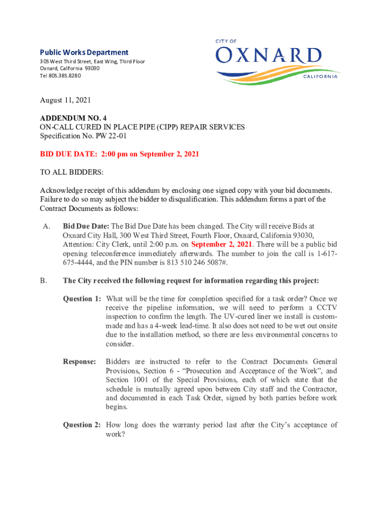 PublicWorksDepartment 305WestThirdStreet,Eating, ThirdFloor Oxnard,California93030 Tel805.385.8280 August 11, 2021, ADDENDUM NO. 4 CALL CURED IN PLACE PIPE (IPP) REPAIR SERVICES Specification No.