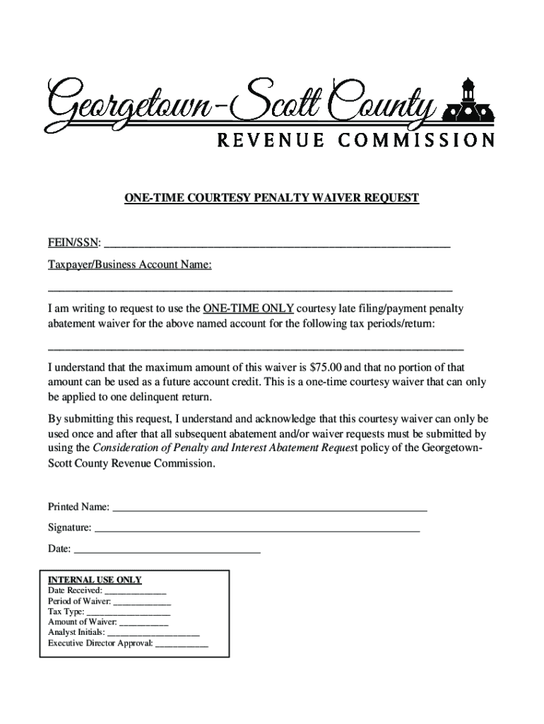 Individuals or organizations who have incurred a penalty and are seeking forgiveness for it are required to file a one-time courtesy penalty waiver.