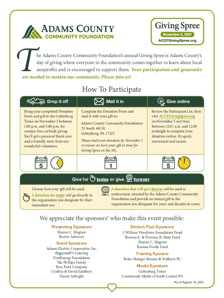 The Adams County Community Foundations annual Giving Spree is Adams Counties day of giving where everyone in the community comes together to learn about local nonprofits and is encouraged to support