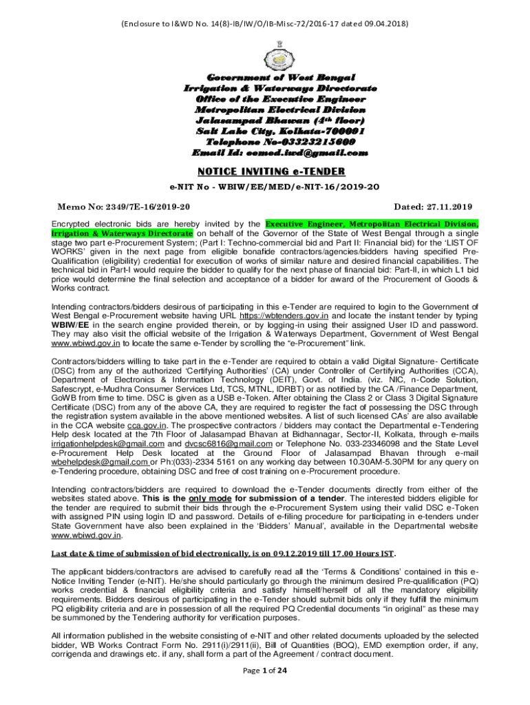 (Enclosure to IOWA No. 14(8)IB/IN/O/IBMisc72/201617 dated 09.04.2018)Government of West Bengal Irrigation & Waterways Directorate Office of the Executive Engineer Metropolitan Electrical Division