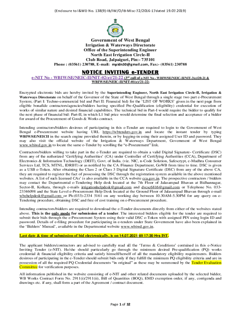 Get the free e-NIT No - WBIW/SE/NEIC-II/NIT-02(e)/21-22 (3rd call of e-NIT No - WBIW/SE/NEIC-II/N...