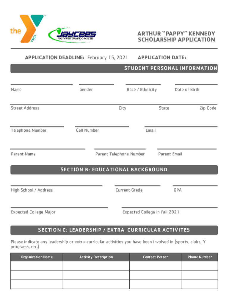 YMCA OF CENTRAL FLORIDA & SOUTHWEST ORLANDO JAYCEESApplication Deadline: February 15, 2021YMCA OF CENTRAL FLORIDA & SOUTHWEST ORLANDO JAYCEES ARTHUR PAPPY KENNEDY SCHOLARSHIP ABOUT THE ARTHUR PAPPY