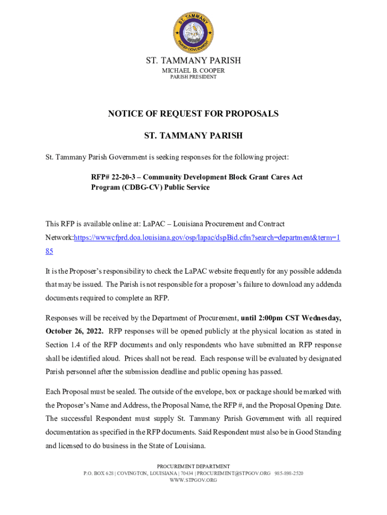 ST. TAMMANY PARISH MICHAEL B. COOPER PARISH PRESIDENTNOTICE OF REQUEST FOR PROPOSALS ST. TAMMANY PARISH St. Tammany Parish Government is seeking responses for the following project: RFP# 22203 Community