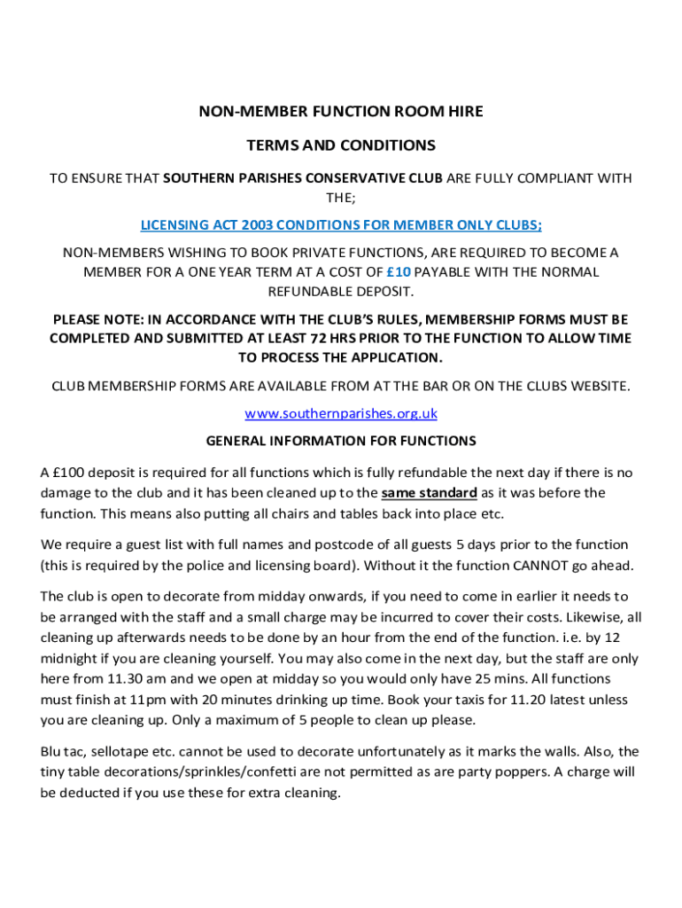 NONMEMBER FUNCTION ROOM HIRE TERMS AND CONDITIONS TO ENSURE THAT SOUTHERN PARISHES CONSERVATIVE CLUB ARE FULLY COMPLIANT WITH THE; LICENSING ACT 2003 CONDITIONS FOR MEMBER ONLY CLUBS; NONMEMBERS WISHING