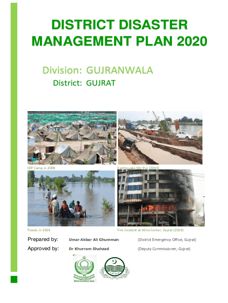 DISTRICT DISASTER MANAGEMENT PLAN 2020 Division: GUJRANWALA District: GUJARATI Camp in 2009Earthquake Mir PUR (2019)Floods in 2014Fire incident at Alina Center, Gujrat (2019)Prepared by:Umar Akbar