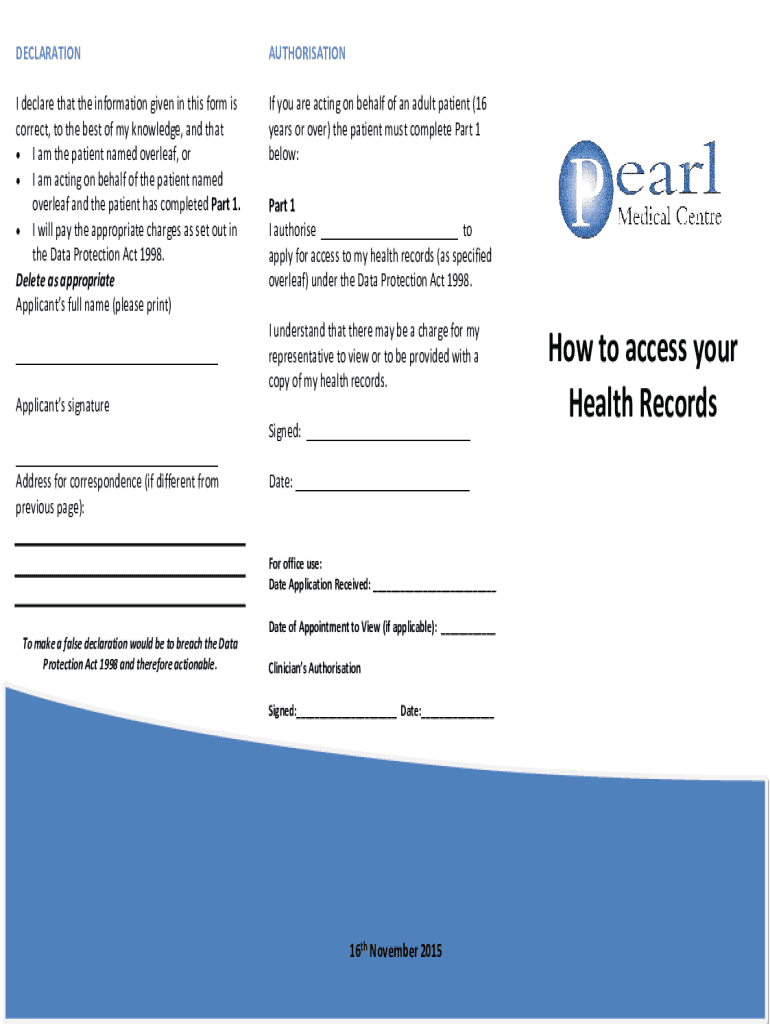 DECLARATIONAUTHORISATIONI declare that the information given in this form is correct, to the best of my knowledge, and that I am the patient named overleaf, or I am acting on behalf of the patient