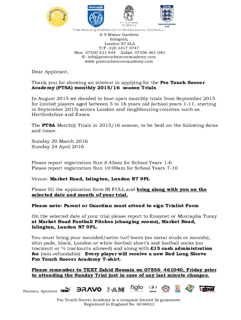 THE BRIDGE & EXPERIENCE TO PROFESSIONAL FOOTBALL 69 Manor Gardens Arlington, London N7 6LA T/F. 020 3417 0747 Mus. 07500 421 944 Zahid. 07856 461 040 E: info@protouchsocceracademy.com www.protouchsocceracademy.comDear