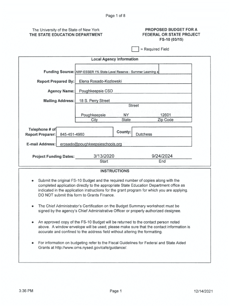 Page 1 of 8PROPOSED BUDGET FORA FEDERAL OR STATE PROJECT FS10 (03/15)The University of the State of New York THE STATE EDUCATION DEPARTMENT Required FieldLocal Agency InformationFunding Source: DRESSER