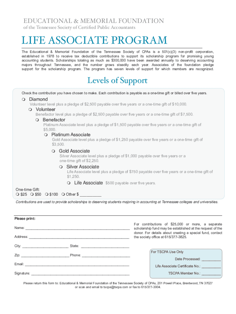 EDUCATIONAL & MEMORIAL FOUNDATION of the Tennessee Society of Certified Public AccountantsLIFE ASSOCIATE PROGRAM The Educational & Memorial Foundation of the Tennessee Society of CPA's is a 501(c)(3)