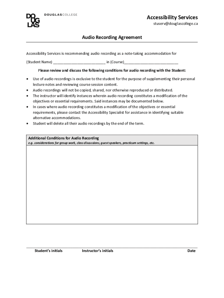 Accessibility Services stuserv@douglascollege.caAudio Recording Agreement Accessibility Services is recommending audio recording as a note-taking accommodation for (Student Name) ___ in (Course)___