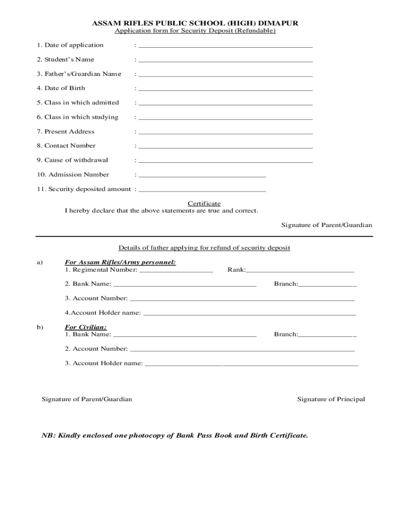 ASSAM RIFLES PUBLIC SCHOOL (HIGH) DIMAPUR Application form for Security Deposit (Refundable) 1. Date of application: ___2. Students Name: ___3. Fathers/Guardian Name: ___4. Date of Birth: ___5. Class