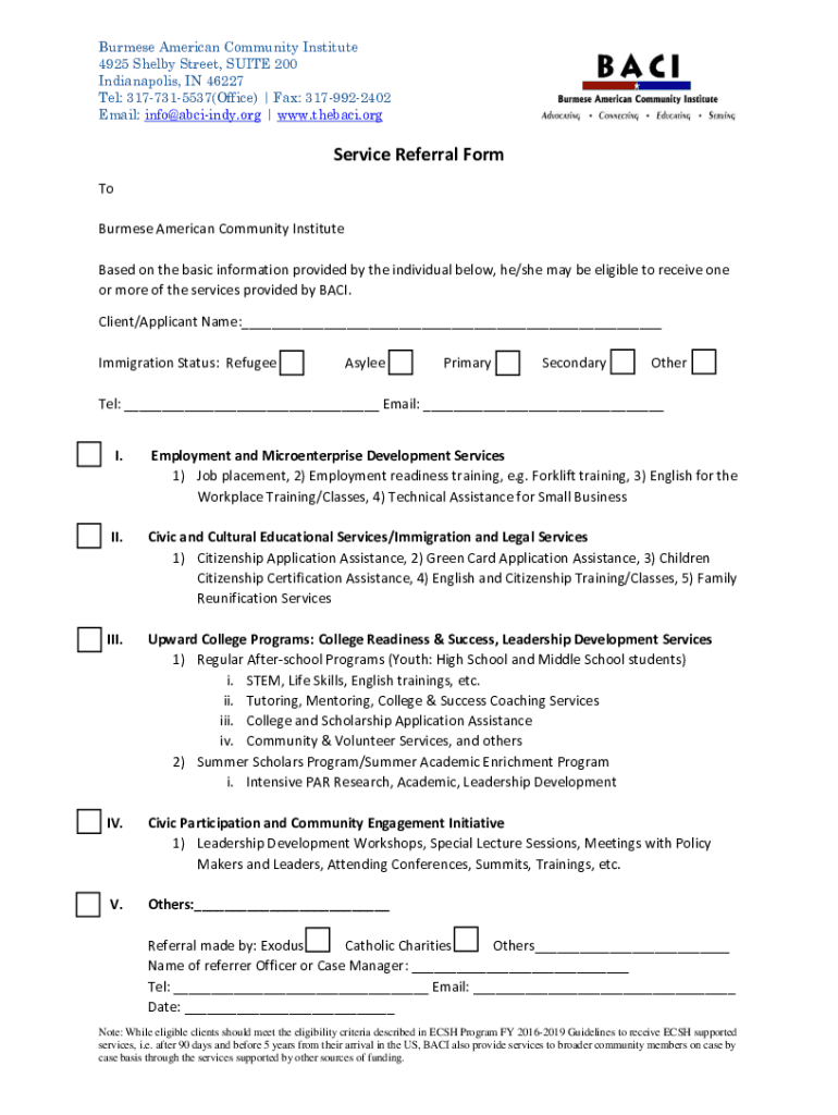 Burmese American Community Institute 4925 Shelby Street, SUITE 200 Indianapolis, IN 46227 Tel: 3177315537(Office) | Fax: 3179922402 Email: info@abciindy.org | www.thebaci.orgService Referral Form