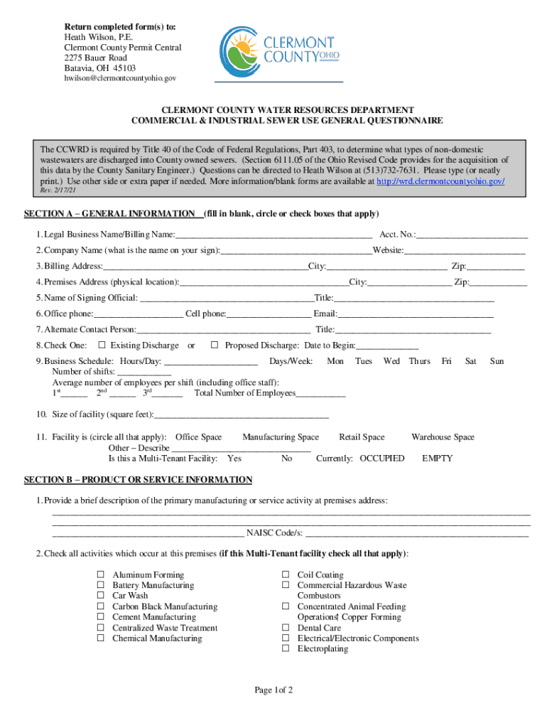 Return completed form(s) to: Heath Wilson, P.E. Clermont County Permit Central 2275 Bauer Road Batavia, OH 45103 hwilson@clermontcountyohio.govCLERMONT COUNTY WATER RESOURCES DEPARTMENT COMMERCIAL
