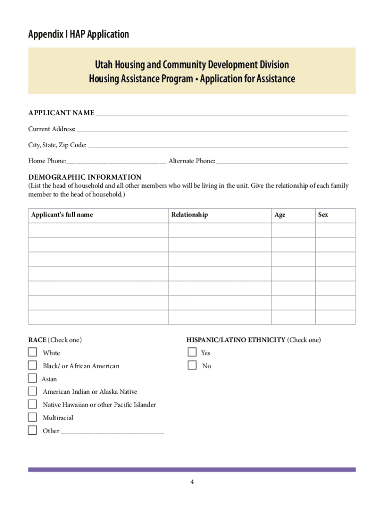 Appendix I HAP Application Utah Housing and Community Development Division Housing Assistance Program Application for Assistance APPLICANT NAME ___ Current Address: ___ City, State, Zip Code: ___