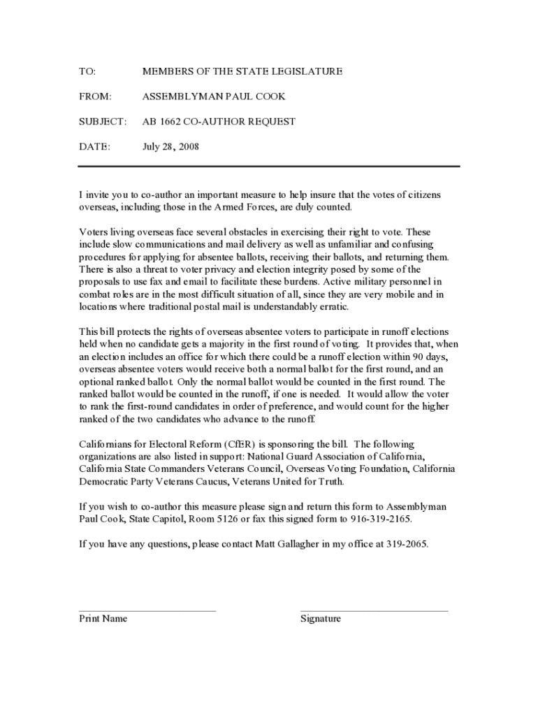 TO:MEMBERS OF THE STATE LEGISLATUREFROM:ASSEMBLYMAN PAUL COOKSUBJECT:AB 1662 COAUTHOR SEQUESTRATE:July 28, 2008I invite you to coauthor an important measure to help ensure that the votes of citizens