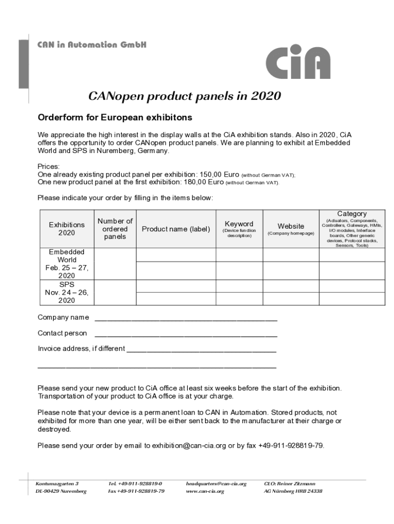 CAN in Automation GmbHCiACANopen product panels in 2020 Order form for European exhibitions We appreciate the high interest in the display walls at the CIA exhibition stands. Also in 2020, CIA offers