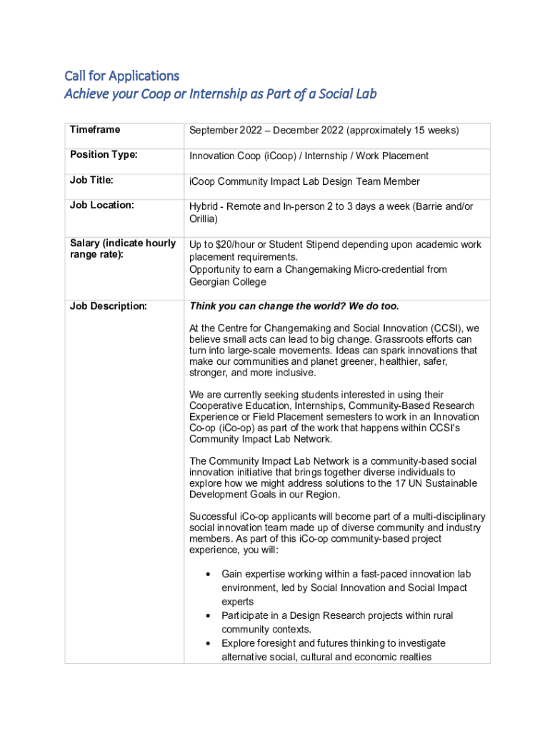 Call for Applications Achieve your Coop or Internship as Part of a Social Lab TimeframeSeptember 2022 December 2022 (approximately 15 weeks)Position Type:Innovation Coop (scoop) / Internship / Work