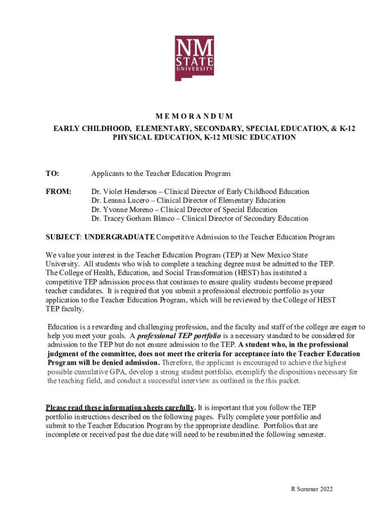 MEMORANDUM EARLY CHILDHOOD, ELEMENTARY, SECONDARY, SPECIAL EDUCATION, & K12 PHYSICAL EDUCATION, K12 MUSIC EDUCATION TO:Applicants to the Teacher Education ProgramFROM:Dr. Violet Henderson Clinical