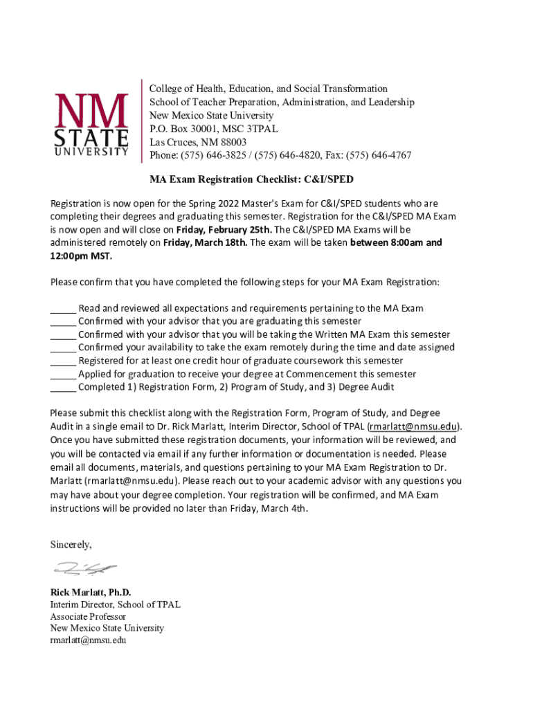 College of Health, Education, and Social Transformation School of Teacher Preparation, Administration, and Leadership New Mexico State University P.O. Box 30001, MSC 3TPAL Las Cruces, NM 88003 Phone: