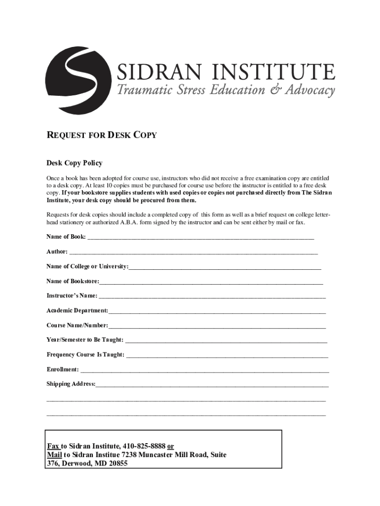 REQUEST FOR DESK COPY Policy Once a book has been adopted for course use, instructors who did not receive a free examination copy are entitled to a desk copy. At least 10 copies must be purchased