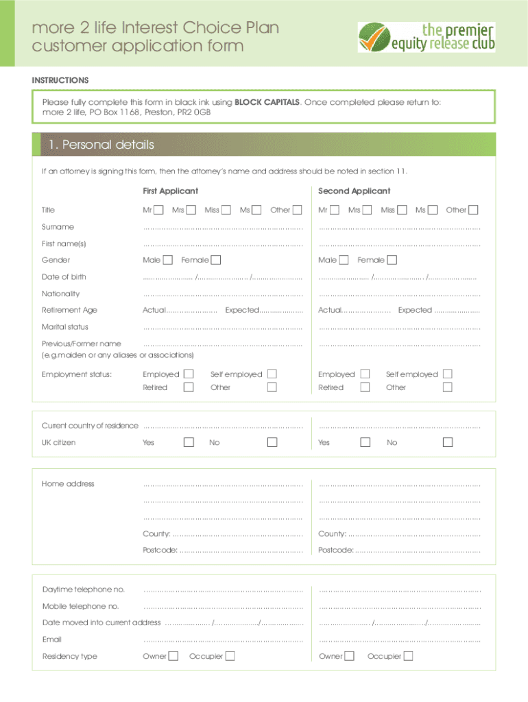 More 2 life Interest Choice Plan customer application form INSTRUCTIONS Please fully complete this form in black ink using BLOCK CAPITALS. Once completed please return to: more 2 life, PO Box 1168,