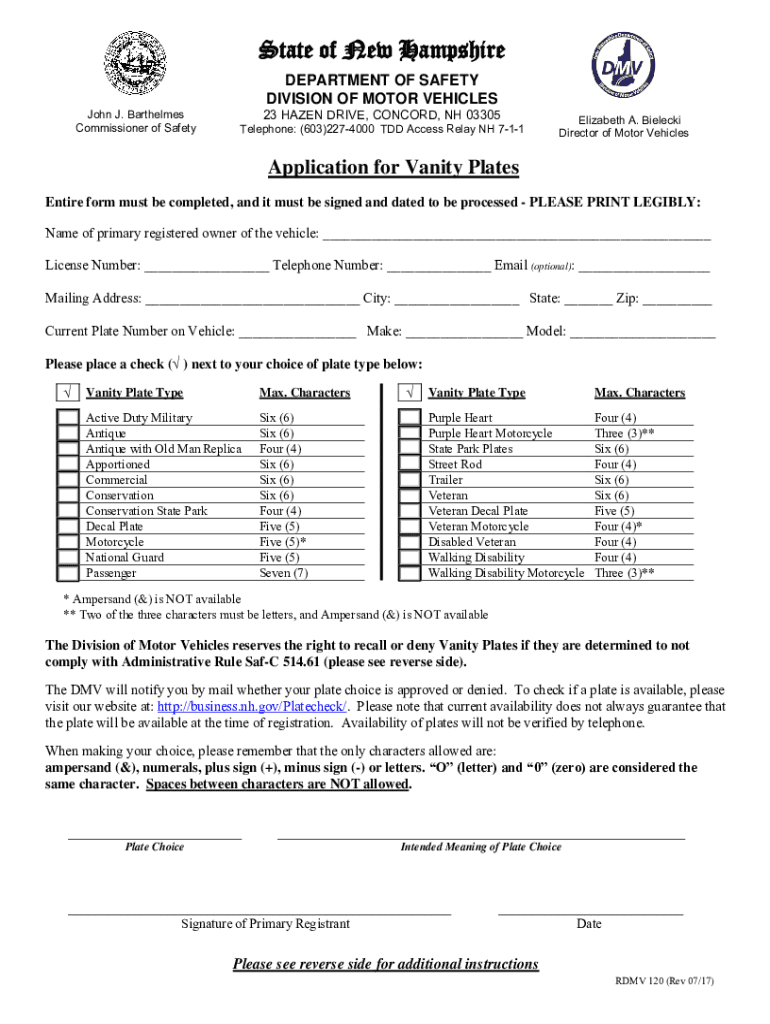 DIVISION OF MOTOR VEHICLES23 HAVEN DRIVE, CONCORD, NH 03305Telephone: (603)2274000 TDD Access Relay NH 711Elizabeth