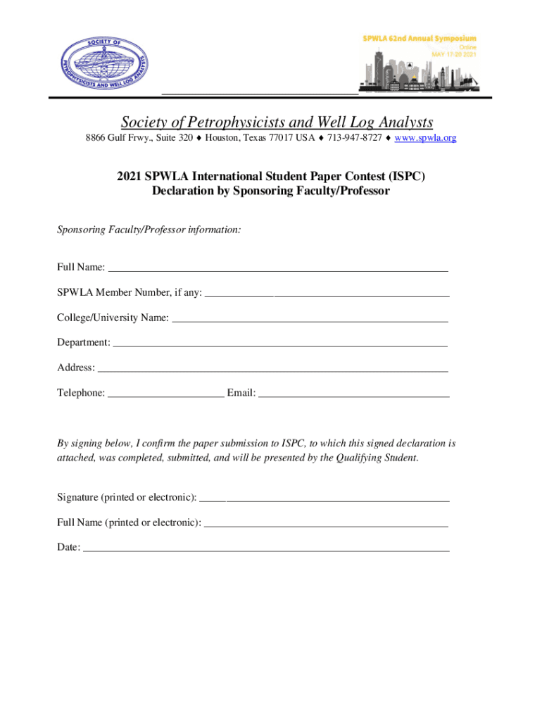 Society of Astrophysicists and Well Log Analysts8866 Gulf Fry., Suite 320 Houston, Texas 77017 USA 7139478727 www.spwla.org2021 SPW LA International Student Paper Contest (ISP) Declaration by Sponsoring