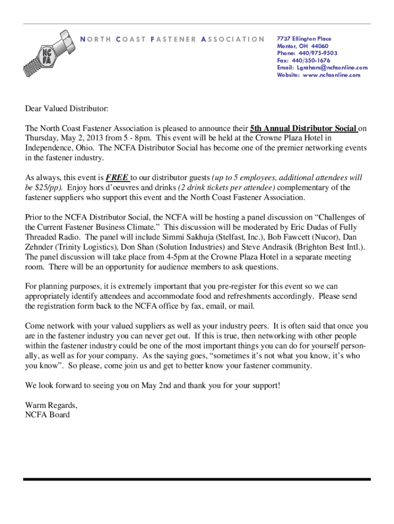 NORTH COAST FASTENER ASSOCIATION7737 Ellington Place Mentor, OH 44060 Phone: 440/9759503 Fax: 440/3501676 Email: Lgraham@ncfaonline.com Website: www.ncfaonline.comDear Valued Distributor: The North