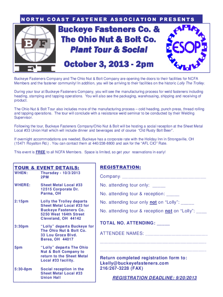 NORTH COAST FASTENER ASSOCIATION PRESENTSBuckeye Fasteners Co. & The Ohio Nut & Bolt Co. Plant Tour & Social October 3, 2013 2pm Buckeye Fasteners Company and The Ohio Nut & Bolt Company are opening