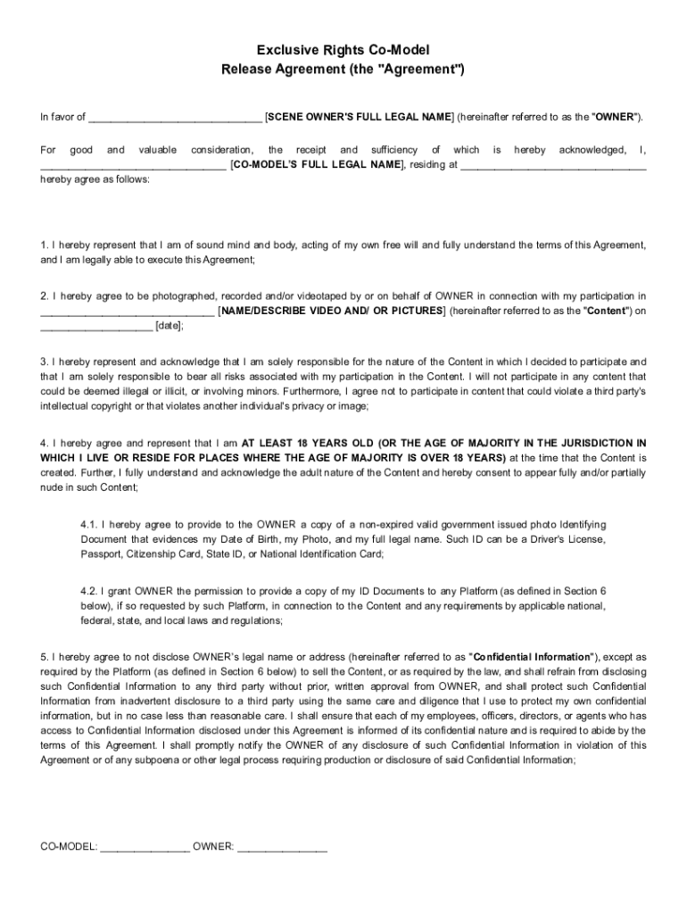 Exclusive Rights Model Release Agreement (the \” Agreement\”) In favor of ___ [SCENE OWNER\'S FULL LEGAL NAME] (hereinafter referred to as the \” OWNER\”). For good and valuable consideration,