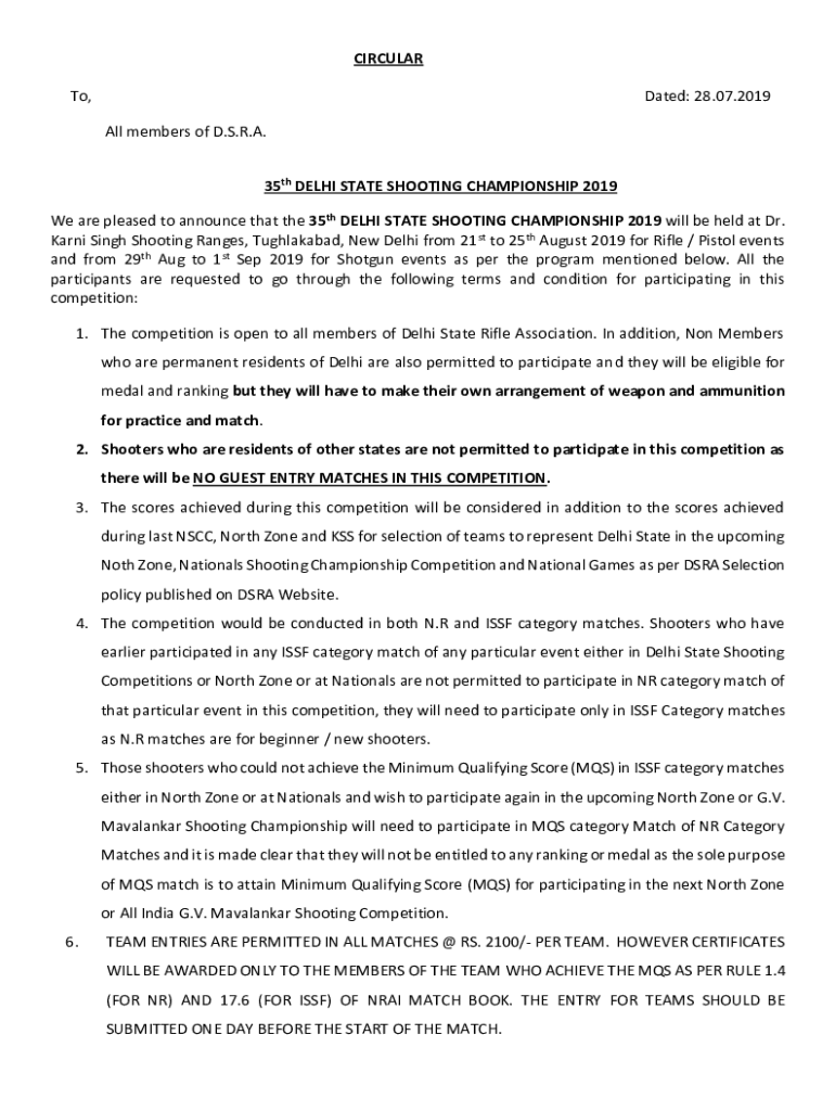 CIRCULAR To, Dated: 28.07.2019 All members of D.S.R.A. 35th DELHI STATE SHOOTING CHAMPIONSHIP 2019We are pleased to announce that the 35th DELHI STATE SHOOTING CHAMPIONSHIP 2019 will be held at Dr.