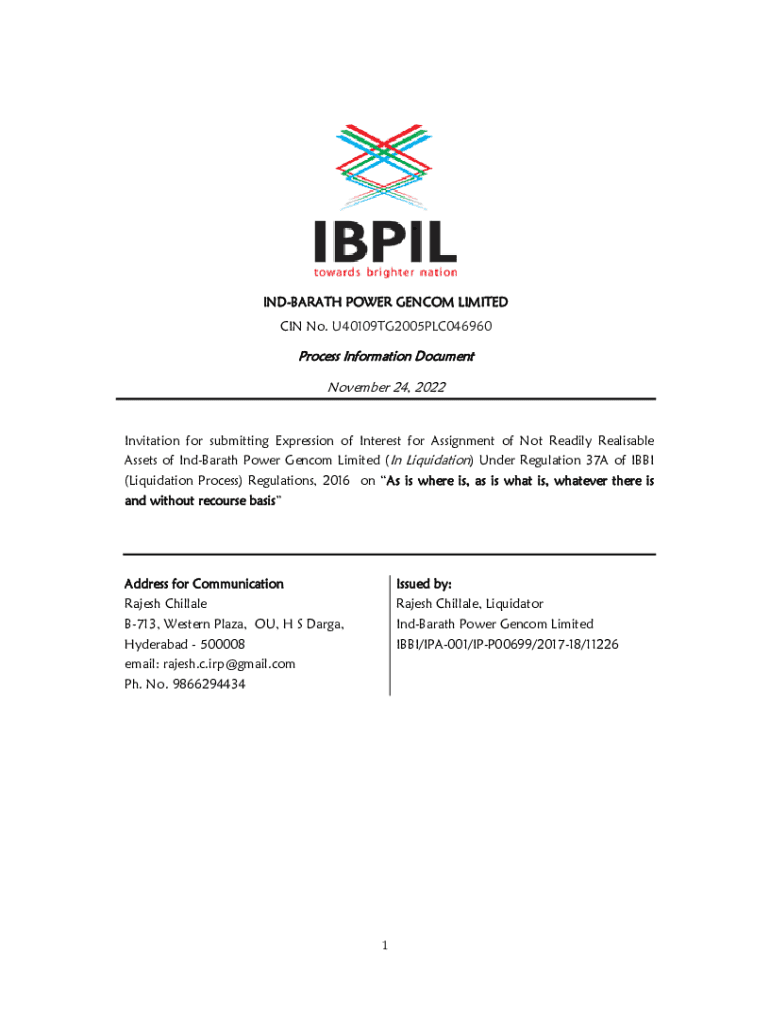 INDBARATH POWER GEN COM LIMITED IN No. U40109TG2005PLC046960Process Information Document November 24, 2022Invitation for submitting Expression of Interest for Assignment of Not Readily Realizable