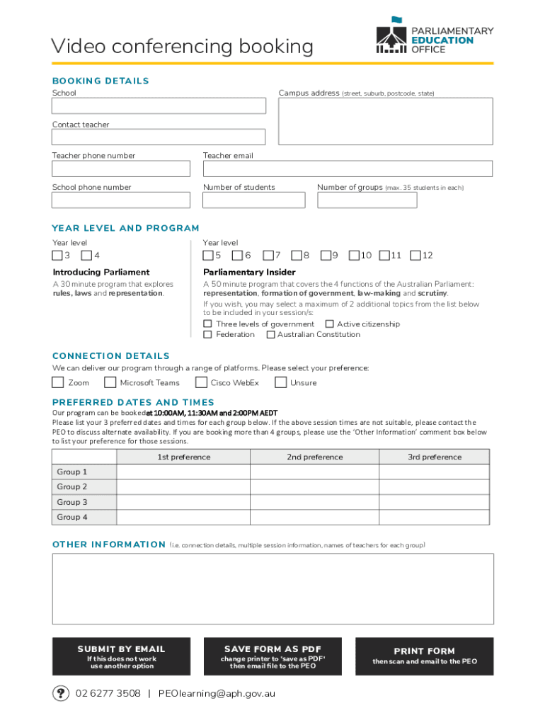 SchoolCampus address (street, suburb, postcode, state)Contact teacherTeacher phone numberTeacher emailSchool phone numberNumber of studentsNumber of groups (max.