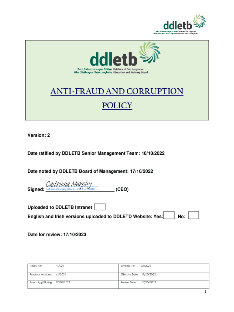 POLICYVersion: 2Date ratified by DDL ETB Senior Management Team: 10/10/2022Date noted by DDL ETB Board of Management: 17/10/2022Caitriona Murphy (Dec 21, 2022 12:39 GMT)