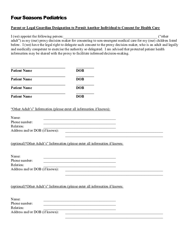 Four Seasons Pediatrics Parent or Legal Guardian Designation to Permit Another Individual to Consent for Health Care I (we) appoint the following person:___ (other adult) as my (our) proxy decision