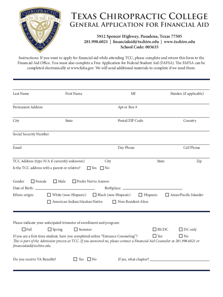 Texas Chiropractic CollegeGeneral Application for Financial Aid 5912 Spencer Highway, Pasadena, Texas 77505 281.998.6021 | financialaid@txchiro.edu | www.txchiro.edu School Code: 003635 Instructions: