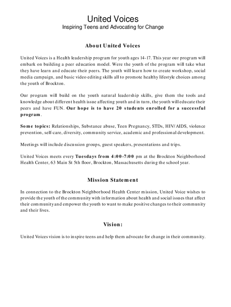 United Voices Inspiring Teens and Advocating for Change About United Voices is a Health leadership program for youth ages 1417. This year our program will embark on building a peer education model.