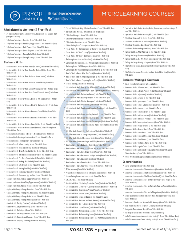 Administrative Assistant & Front Desk 50 Training Activities for Administrative, Secretarial, and Support Staff (self-paced e-book) Telephone Techniques: Greeting (2-min Video With Quiz) Telephone