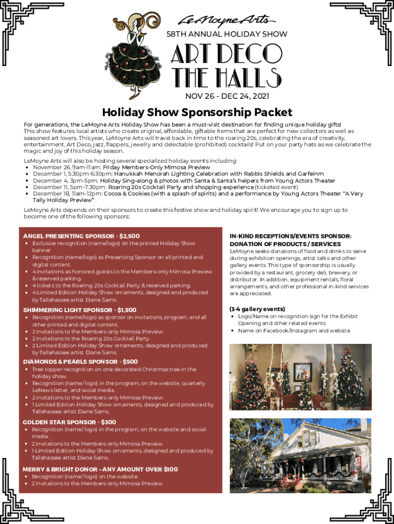 58TH ANNUAL HOLIDAY SHOW Art Deck the Halls NOV 26 DEC 24, 2021Holiday Show Sponsorship Packet For generations, the Lemon Arts Holiday Show has been a must-visit destination for finding unique holiday