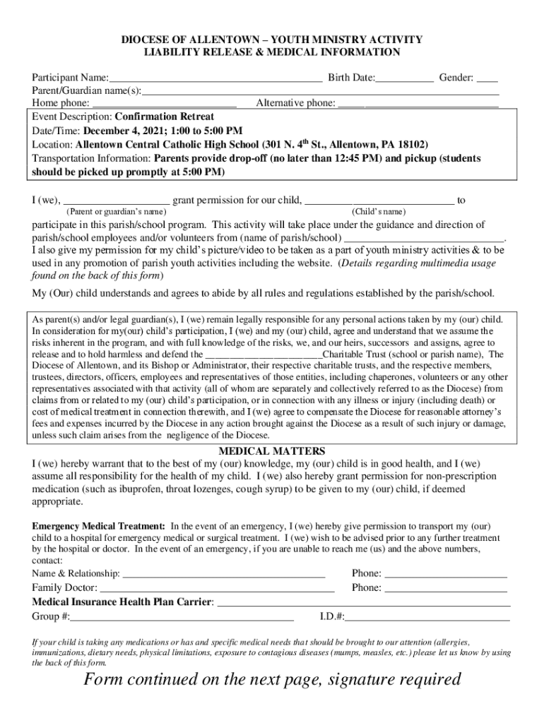 DIOCESE OF ALLENTOWN YOUTH MINISTRY ACTIVITY LIABILITY RELEASE & MEDICAL INFORMATION Participant Name:___ Birth Date:___ Gender: ___ Parent/Guardian name(s):___ Home phone: ___ Alternative phone: