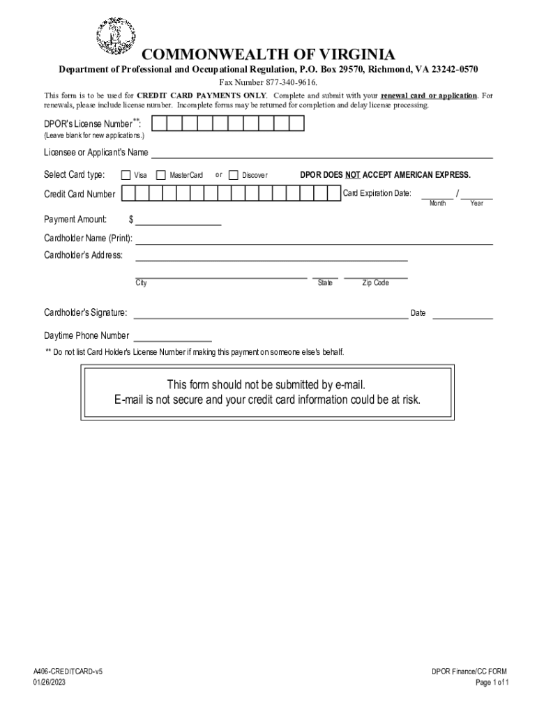 COMMONWEALTH OF VIRGINIADepartment of Professional and Occupational Regulation, P.O. Box 29570, Richmond, VA 232420570 Fax Number 8773409616. This form is to be used for CREDIT CARD PAYMENTS ONLY.