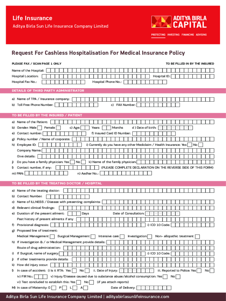 Life Insurance Aditya Barley Sun Life Insurance Company LimitedRequest For Cashless Hospitalization For Medical Insurance Policy PLEASE FAX / SCAN PAGE 1 ONLY TO BE FILLED IN BY THE INSUREDName of