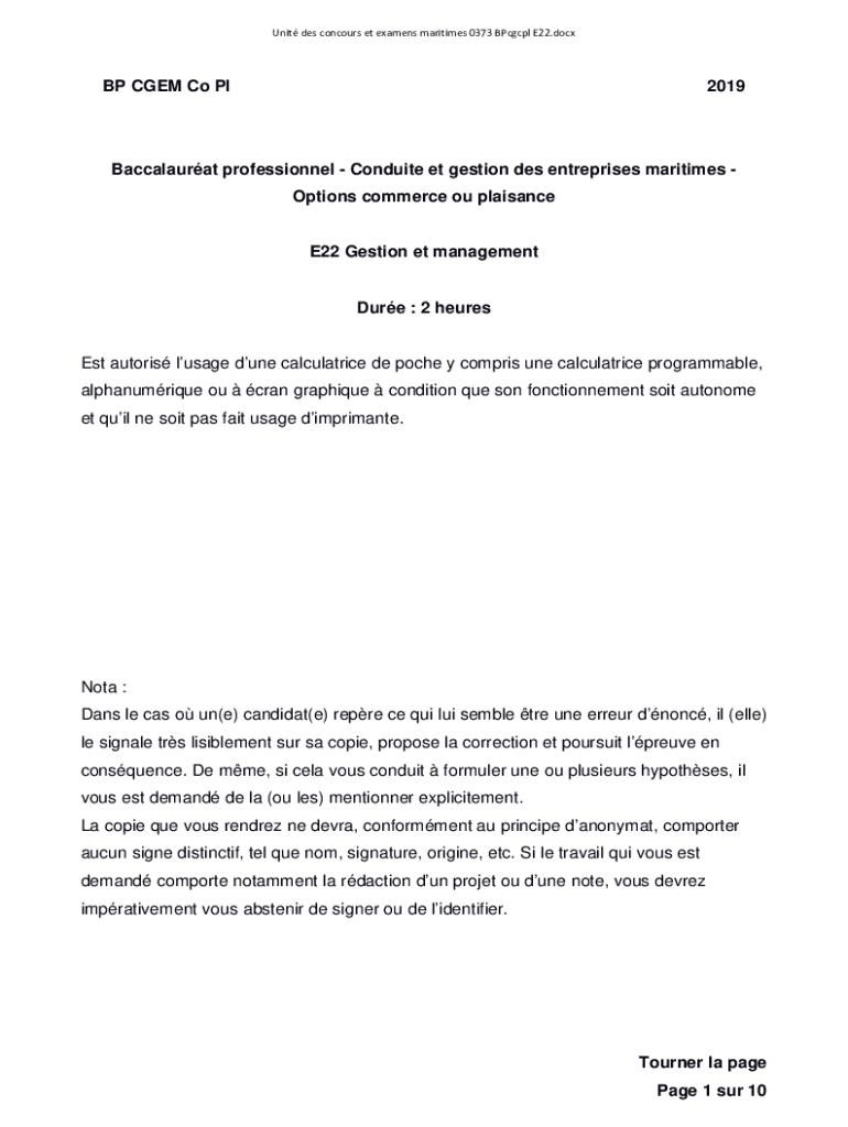 Unitdesconcoursetexamensmaritimes0373BPcgcplE22.DOCX GEM Co Pl2019Baccalaurat professional Conduit ET section DES enterprises maritime Options commerce of plaisanceE22 Section et managementDure :